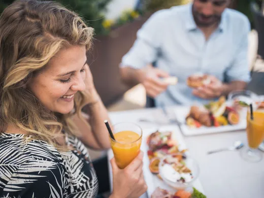 Die große überdachte Terrasse mit kleiner Lounge-Ecke ist besonders gemütlich und der perfekte Ort für einen Kaffeeklatsch mit der besten Freundin, ein Familienessen mit einem guten Glas Wein, den Geburtstagsbrunch der Schwiegermutter oder einfach nur eine kleine Pause mit einer guten Tasse Kaffee oder einem Veneziano.