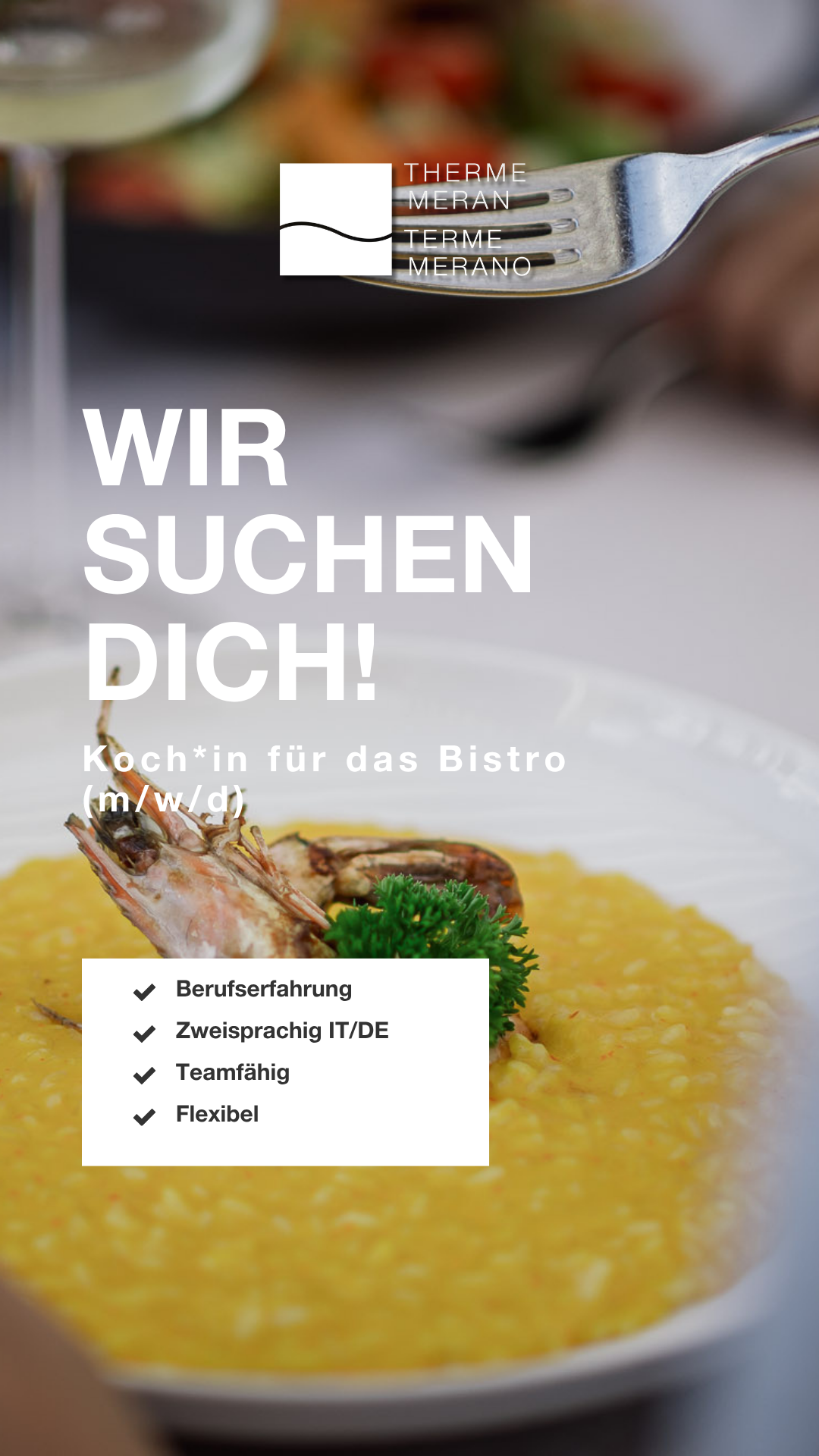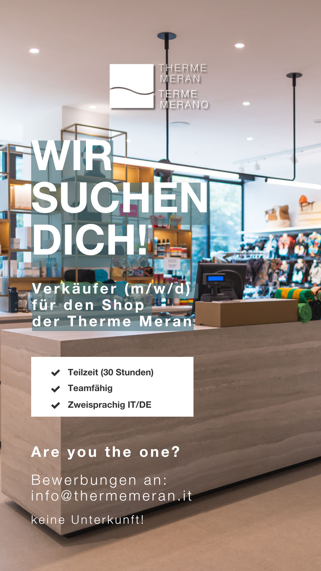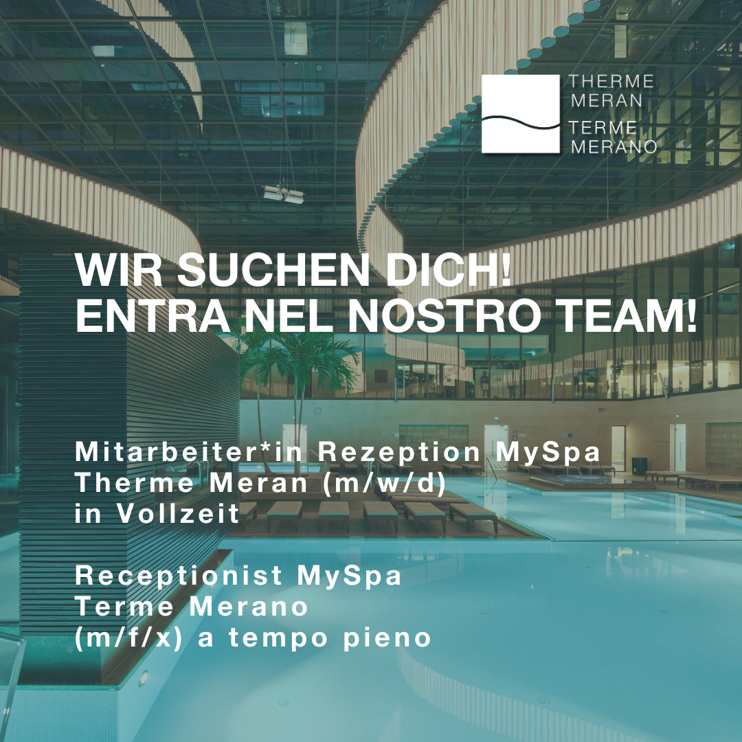 Du suchst nach einem Job, der nicht nur abwechslungsreich, sondern auch sinnvoll ist? Egal, ob du in der Verwaltung, im Pool- oder Saunabereich, in der MySpa oder im Fitness Center arbeiten möchtest. Bei uns in der Therme Meran dreht sich alles um das Wohlbefinden unserer Gäste. Aber natürlich ist es uns genauso wichtig, dass du dich wohlfühlst. Wir denken Gesundheit ganzheitlich.