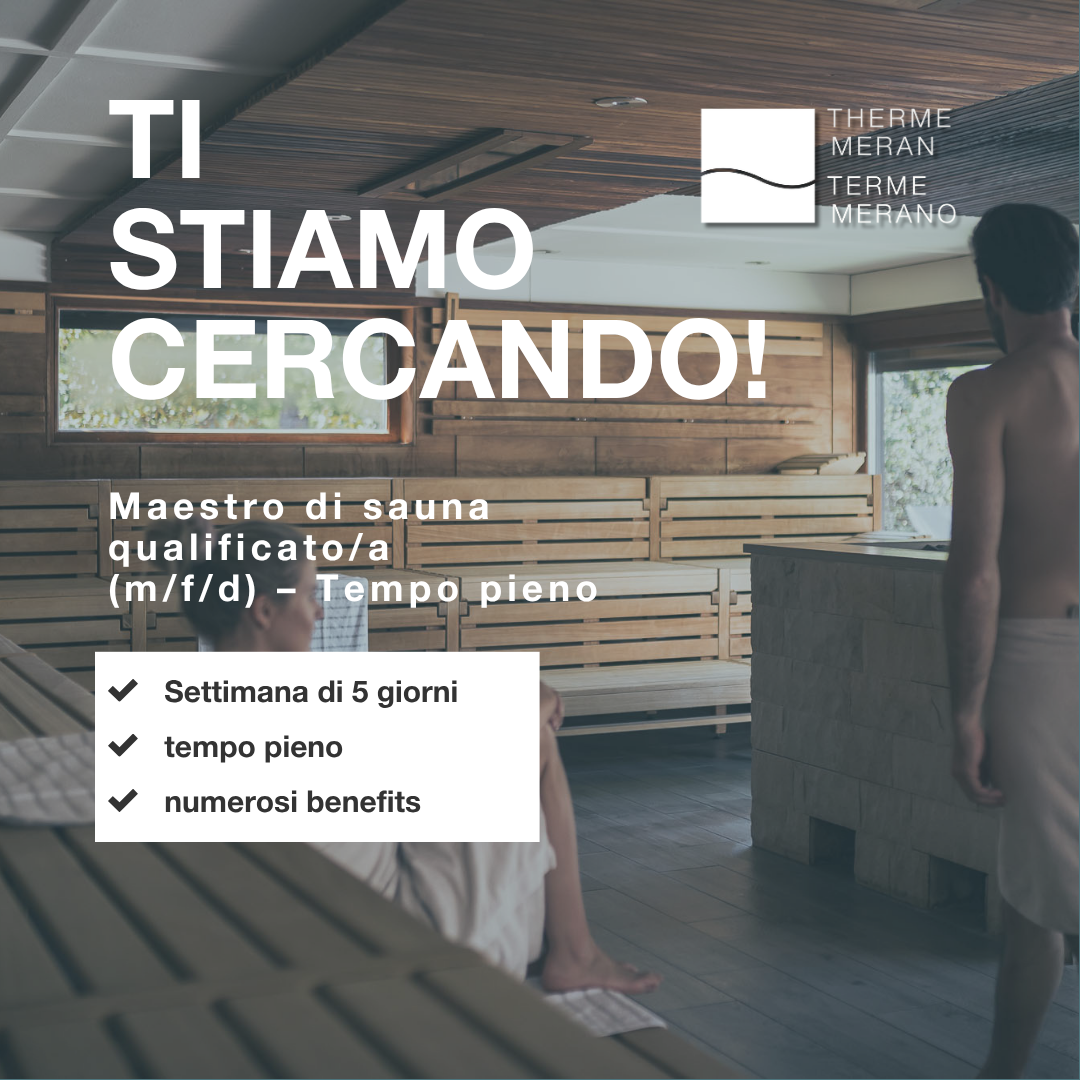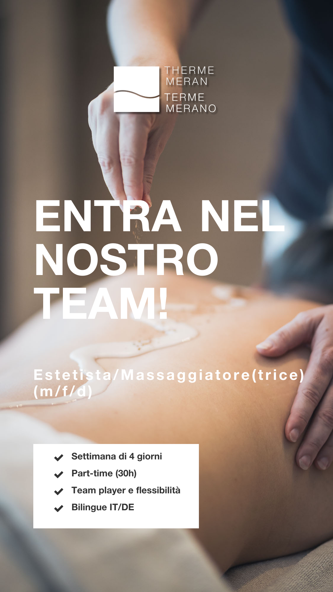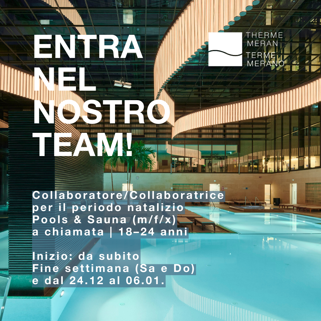 Stai cercando un lavoro che sia non solo vario, ma anche appagante? Che tu voglia lavorare in amministrazione, nell'area piscine o saune, nella MySpa o nel Fitness Center, alle Terme Merano tutto ruota attorno al benessere dei nostri ospiti. Ma, ovviamente, per noi è altrettanto importante che tu ti senta a tuo agio. La salute alle Terme Merano è un concetto olistico.