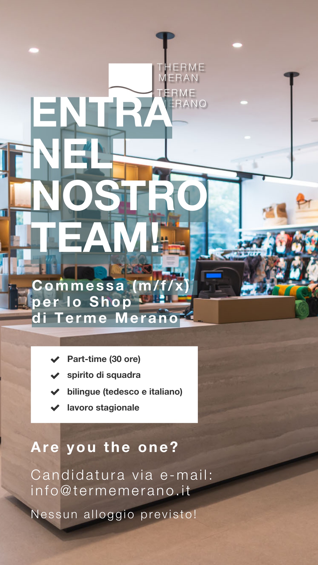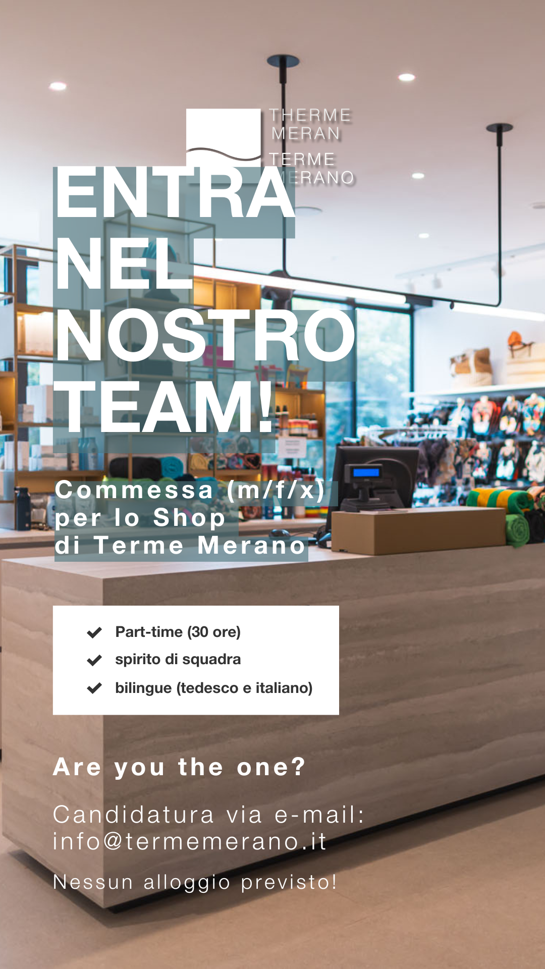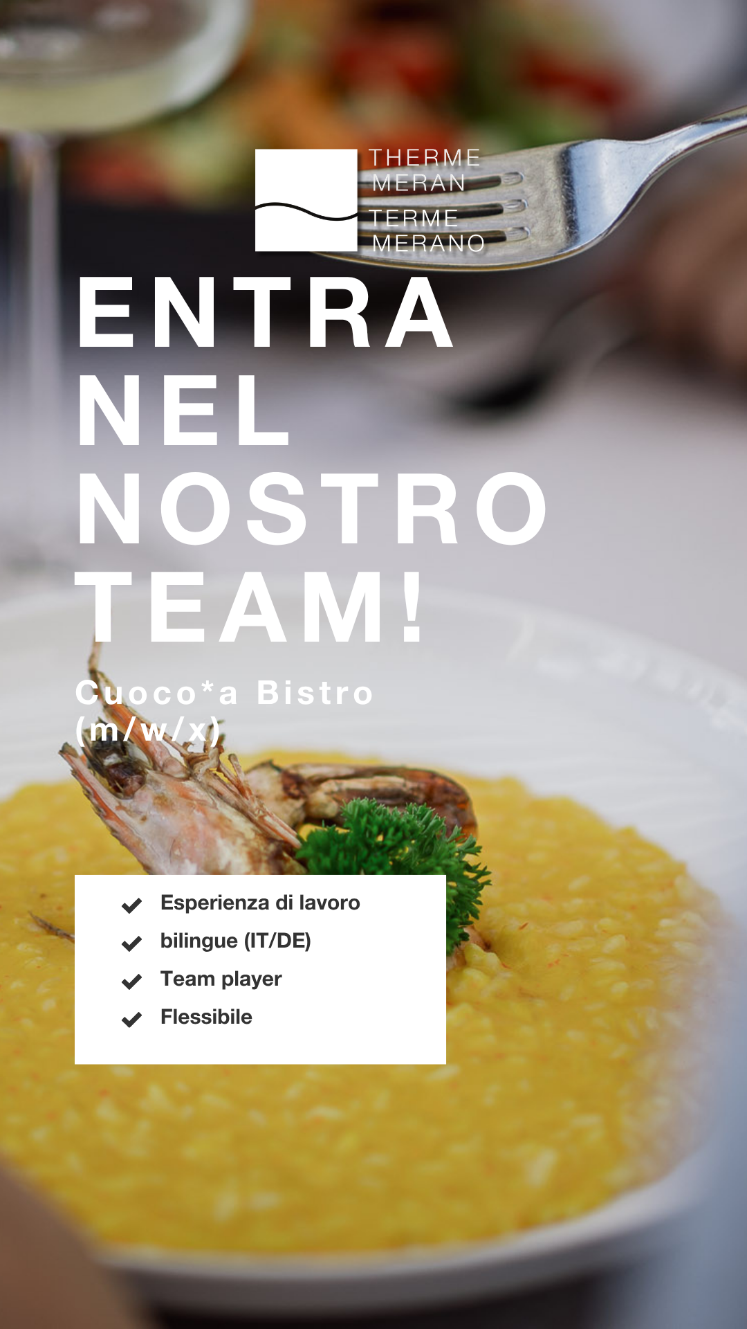 Stai cercando un lavoro che sia non solo vario, ma anche appagante? Che tu voglia lavorare in amministrazione, nell'area piscine o saune, nella MySpa o nel Fitness Center, alle Terme Merano tutto ruota attorno al benessere dei nostri ospiti. Ma, ovviamente, per noi è altrettanto importante che tu ti senta a tuo agio. La salute alle Terme Merano è un concetto olistico.