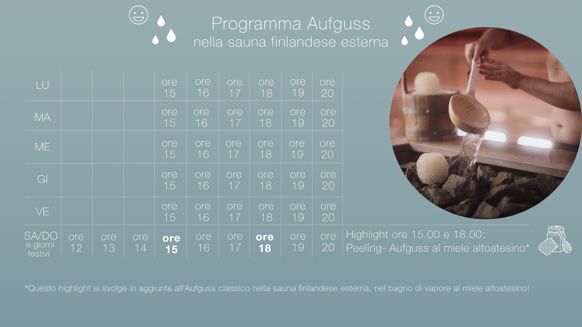 Il bagno di vapore al miele altoatesino (42-45°C, 100 % umidità): Musica rilassante, il ronzio delle api e un dolce profumo di miele. Ti sembra di essere seduto all'interno di un nido d’api mentre ti godi un peeling al miele che purifica in profondità.